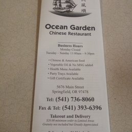 Ocean Garden is a Chinese - New American restaurant located at 5676 Main St Springfield, OR 97478. Known for its diverse menu options and tasty combinations, this restaurant has garnered positive reviews from customers. From soups to entrees like subgum chicken chow mien, pork fried rice, and pork foo yung, Ocean Garden offers a range of choices to satisfy your cravings.